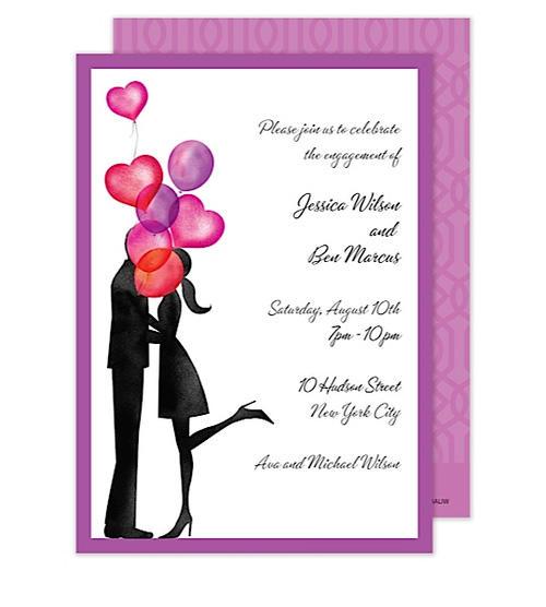 Balloon Love Item Number: BALIW This 5 x 7 invitation or engagement announcement features a silhouette couple kissing behind a beautiful bouquet of purple, pink and red balloons. Includes white envelopes. Proofs are sent via email within two business days Once proof has been approved your order
