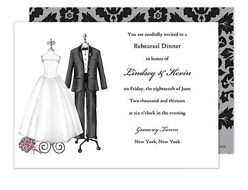 Couple Dress Form Item Number: CDI This 5 x 7 invitation features a wedding dress and tuxedo on dress forms with a rose bouquet in the corner. Includes white envelopes. Proofs are sent via email within two business days Once proof has been approved your order